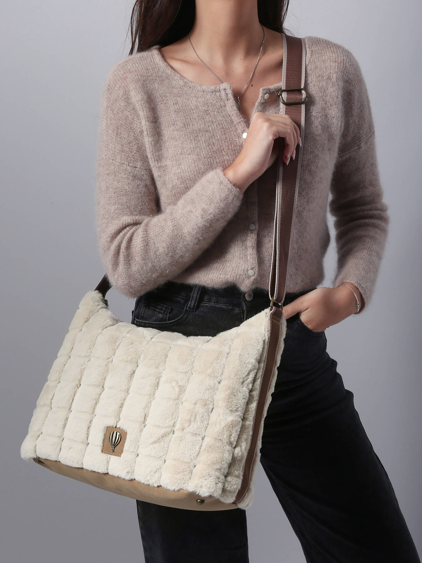 De cross body tas Le Voyage en Panier Quadri Doudou combineert zachtheid, praktisch gemak en elegantie voor een verfijnd dagelijks gebruik. Gemaakt van polyester met een zachte, knuffelachtige textuur, heeft hij een moderne en functionele vorm, ideaal om comfortabel over de schouder te dragen. De ritssluiting zorgt voor een veilige opberging van je persoonlijke spullen, terwijl een extra ritsvak aan de achterzijde snel toegang biedt tot je belangrijkste items. De binnenkant, volledig gevoerd met textiel, bevat één ruim hoofdvak, aangevuld met twee insteekvakken en een ritsvak voor optimale organisatie. Licht en veelzijdig, verenigt de Quadri Doudou hedendaagse stijl met functionaliteit en belichaamt perfect de geest van Le Voyage en Panier: chic, praktisch en eigentijds.