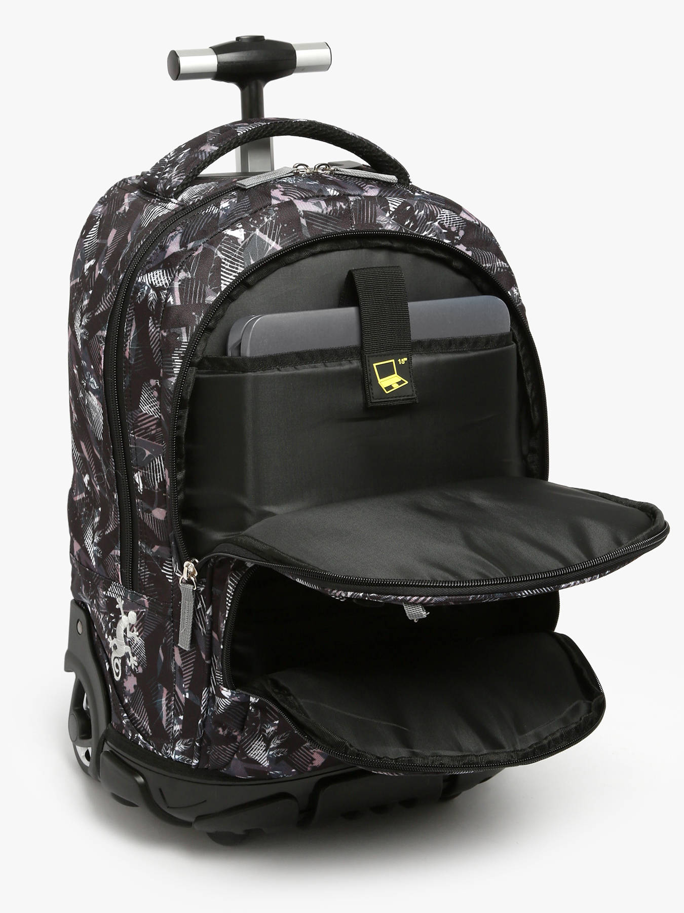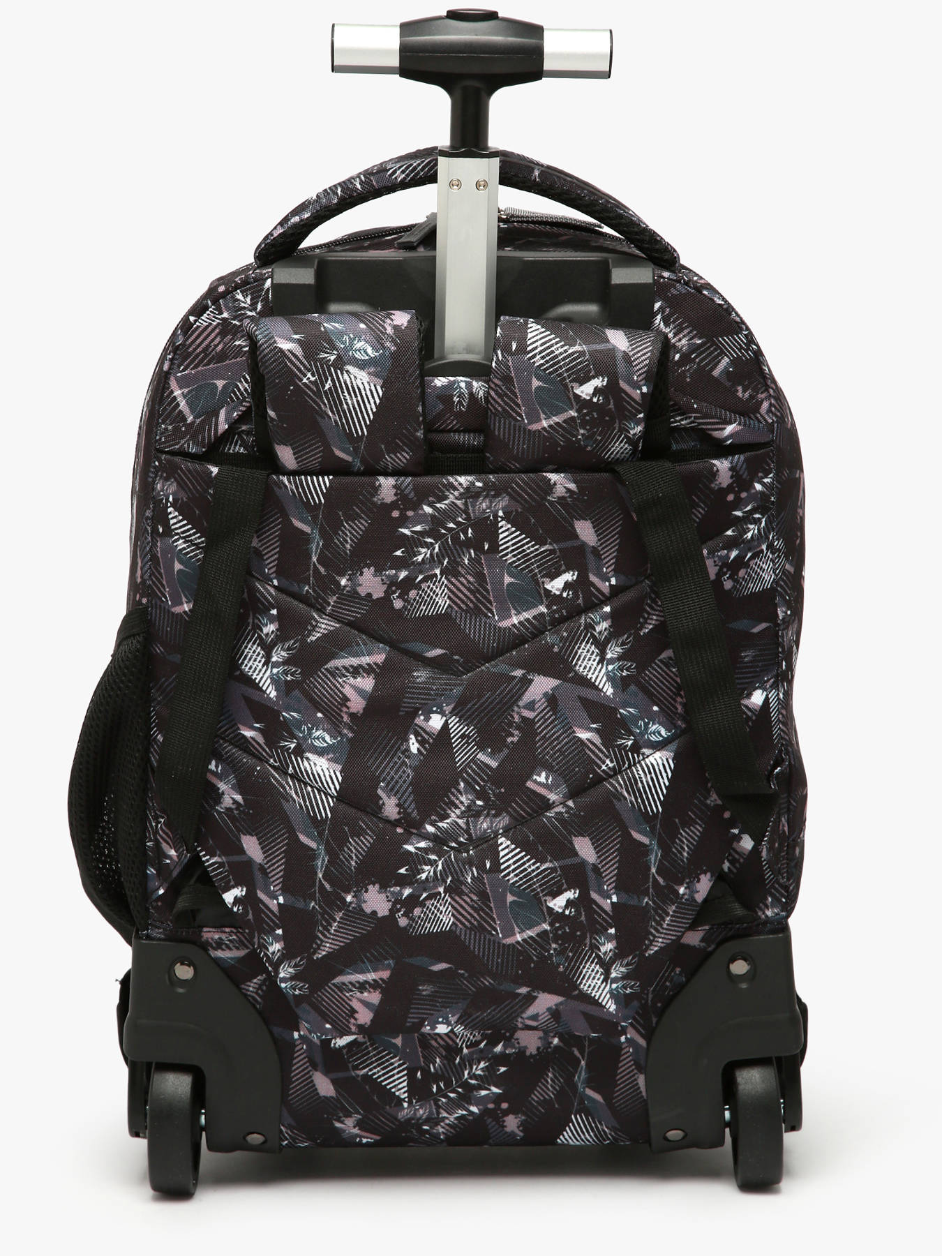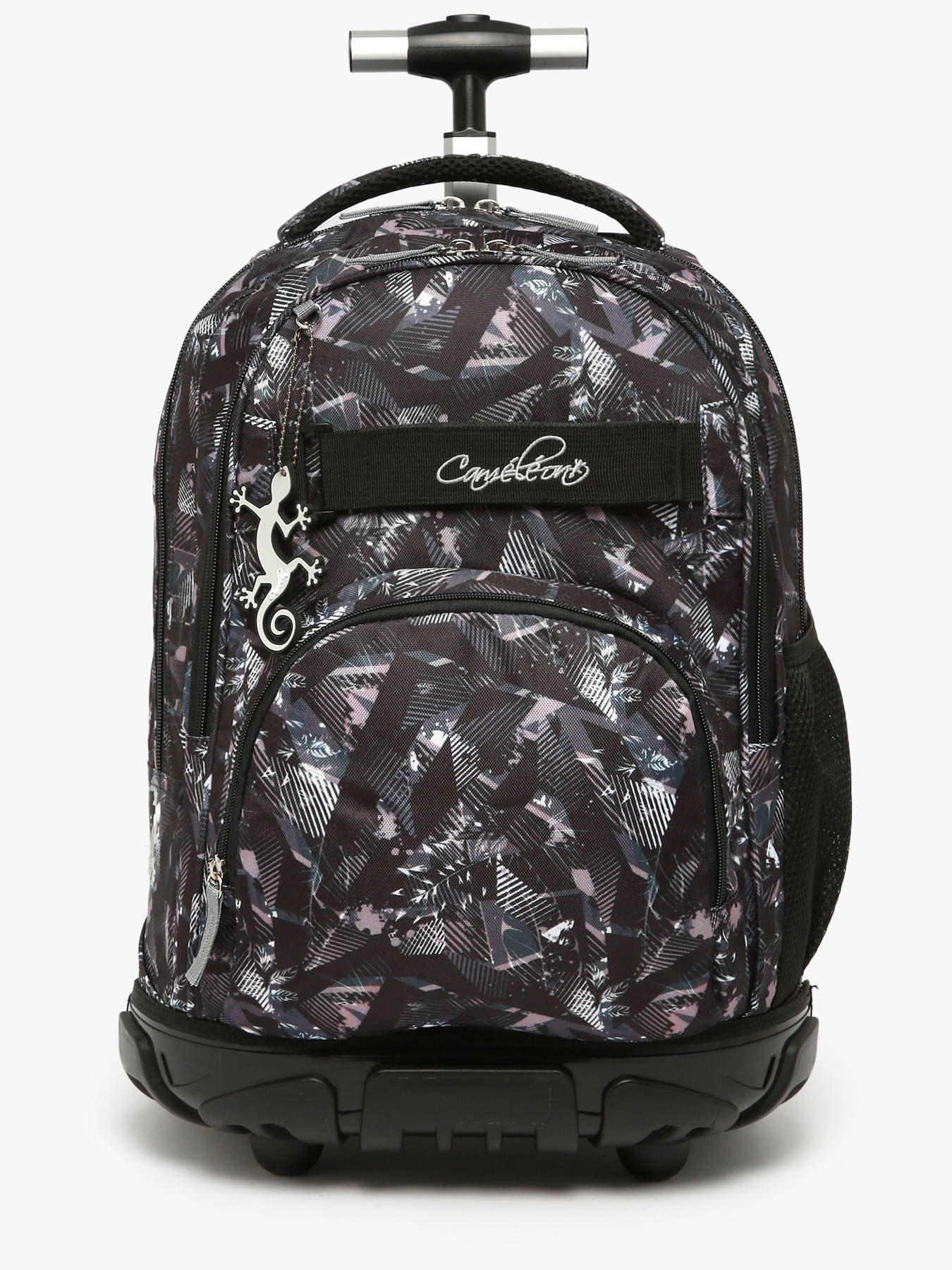 45 cm - 31 liter - 1.9 kg ~ Deze 45 cm rugzak met wieltjes uit de Futur-lijn van Caméléon is ideaal voor leerlingen vanaf het derde leerjaar. De uitgesproken all-over print, verkrijgbaar in Pixel Grey of Pixel Pink, geeft een moderne en trendy uitstraling. Met twee hoofdvakken en een voorvak met ritssluiting is er genoeg ruimte voor alle formaten schriften (21x29,7 cm, 24x32 cm), A4-mappen en al het schoolmateriaal. Aan de zijkant bevindt zich een meshvak voor een drinkfles. Daarnaast is er een speciaal vak voor een laptop tot 15 inch. Praktisch in gebruik: hij kan gedragen worden als rugzak of worden getrokken als trolley dankzij de klikbare telescopische trekstang, wegklapbare schouderbanden en beschermhoes voor de wielen. De stevige bodem en kunststof behuizing zorgen voor uitstekende duurzaamheid. Een klittenbandriem met geborduurd Caméléon-logo en een bijpassende sleutelhanger maken het geheel compleet. Ontworpen om lang mee te gaan en je dagelijks stijlvol en robuust te begeleiden.