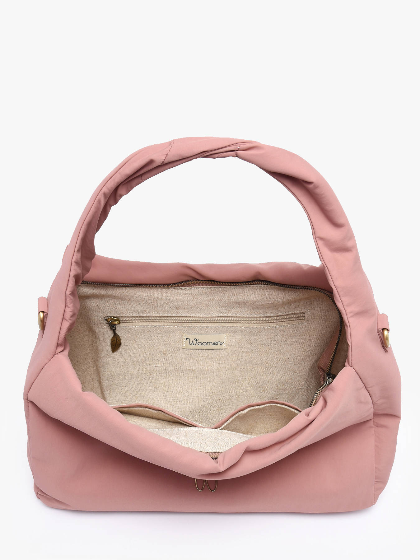 De WOOMEN schoudertas uit de PRIMEVERE-lijn, in middelgroot formaat, valt op door zijn gedraaide hengsel, sierkoordjes en het gouden W-logo in hars. Gemaakt van gerecycled nylon, is hij voorzien van een ritssluiting, een verstelbare en afneembare schouderriem voor draagcomfort op de schouder of crossbody, een achtervak en een met katoen en linnen gevoerde binnenkant met twee insteekvakjes, een ritsvak en één hoofdvak.